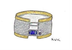 This very special one of a kind ring had her late husband's diamond birthstone custom cut into an elongated baguette, and her sapphire birthstone in an rectangle cut. A nod was given to a brother she loss with the small amethyst stone. It is a combination of white and yellow gold in a hand fabricated bespoke ring.