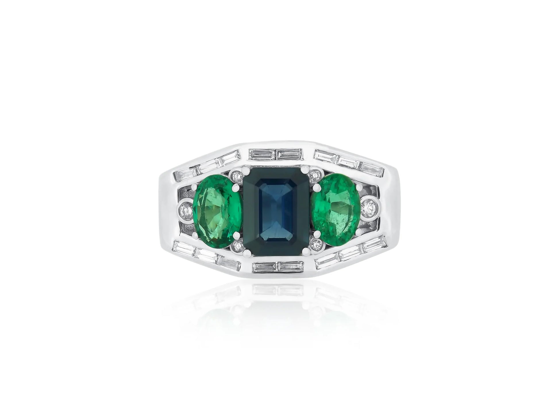 This stunning combination  is a exquisite spin on a mothers ring.  The three birthstones are sapphire, emerald and diamond.  The client had the one oval emerald.  We added a matching emerald, sapphire and diamonds.  Baguette diamonds run down the edges of this signature square shank ring.  A masterpiece!