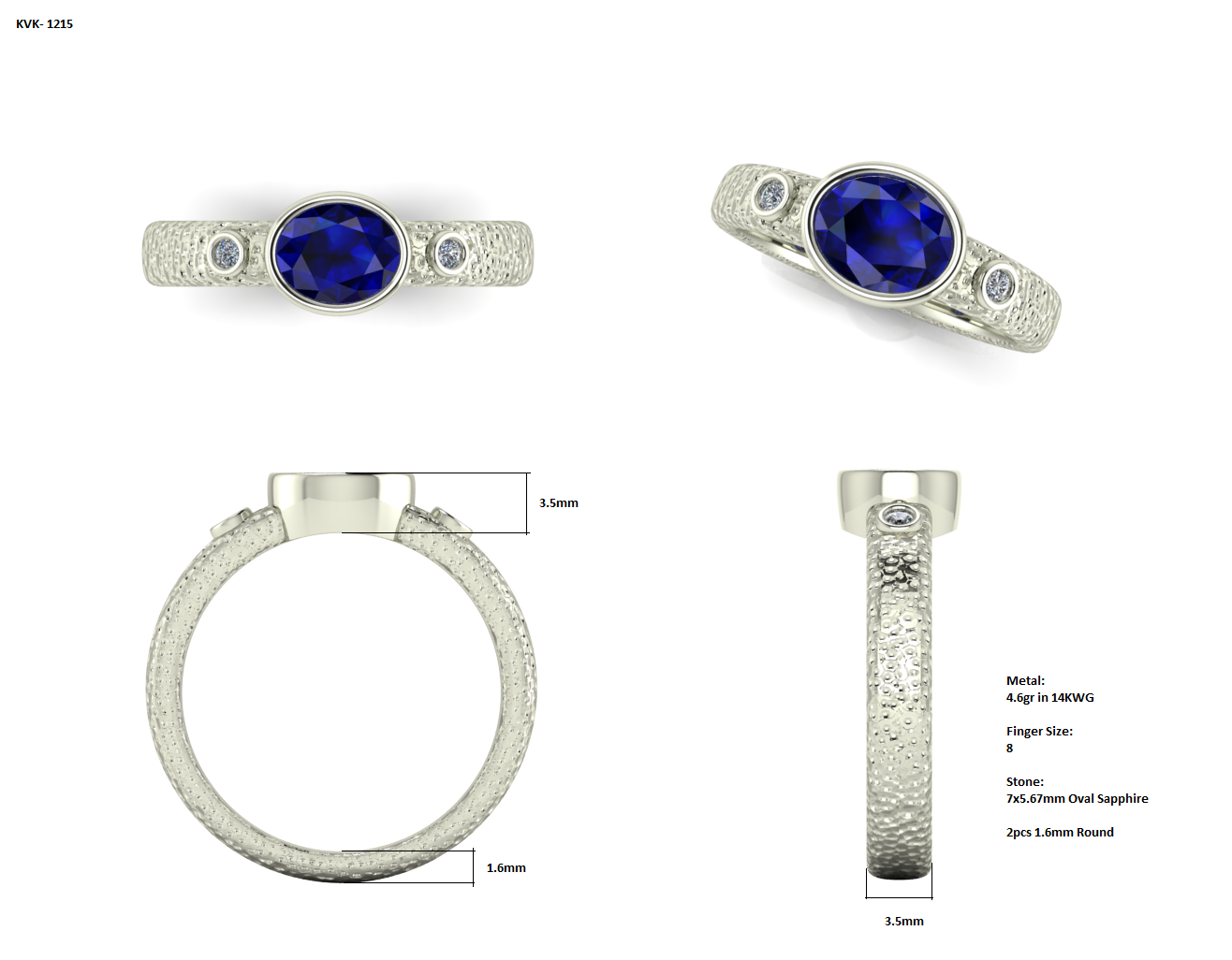 This hand made ring is set with a center blue sapphire that is horizontally set. We accented it with two bezel set diamonds. The band is in white gold and has a hand hammered texture finish. This is ring was custom ordered from a very thoughtful husband to surprise his lovely wife of 50 years!