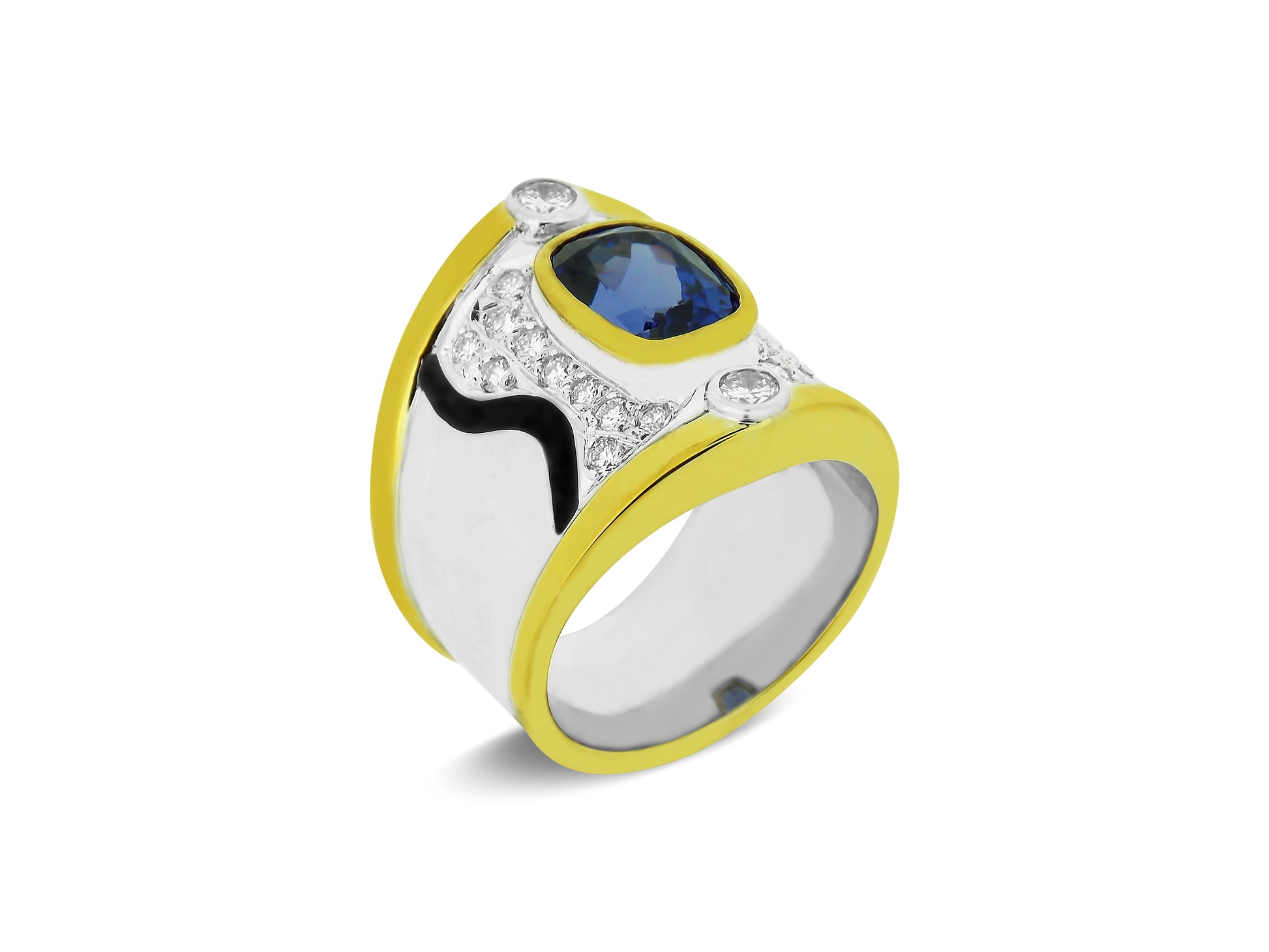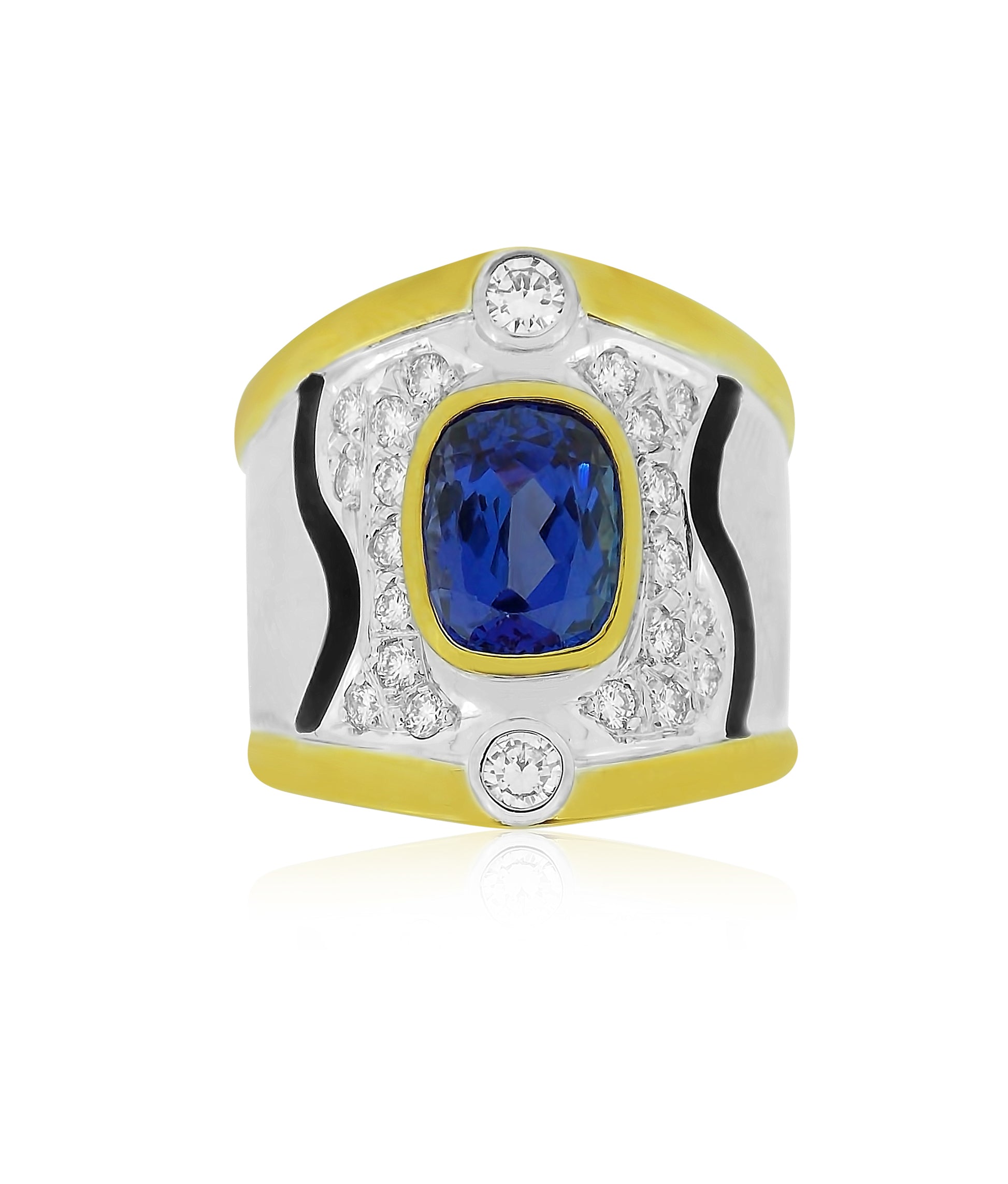 The symbolism in this ring is featured in the black enamel “rivers” on either side of the paved diamonds. The tanzanite center is bezeled set with diamond accents. The band combines both yellow and white gold.