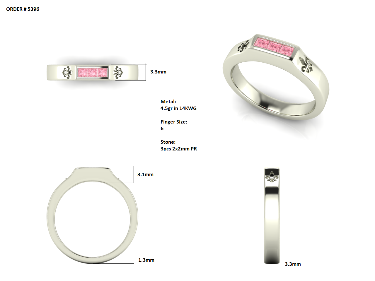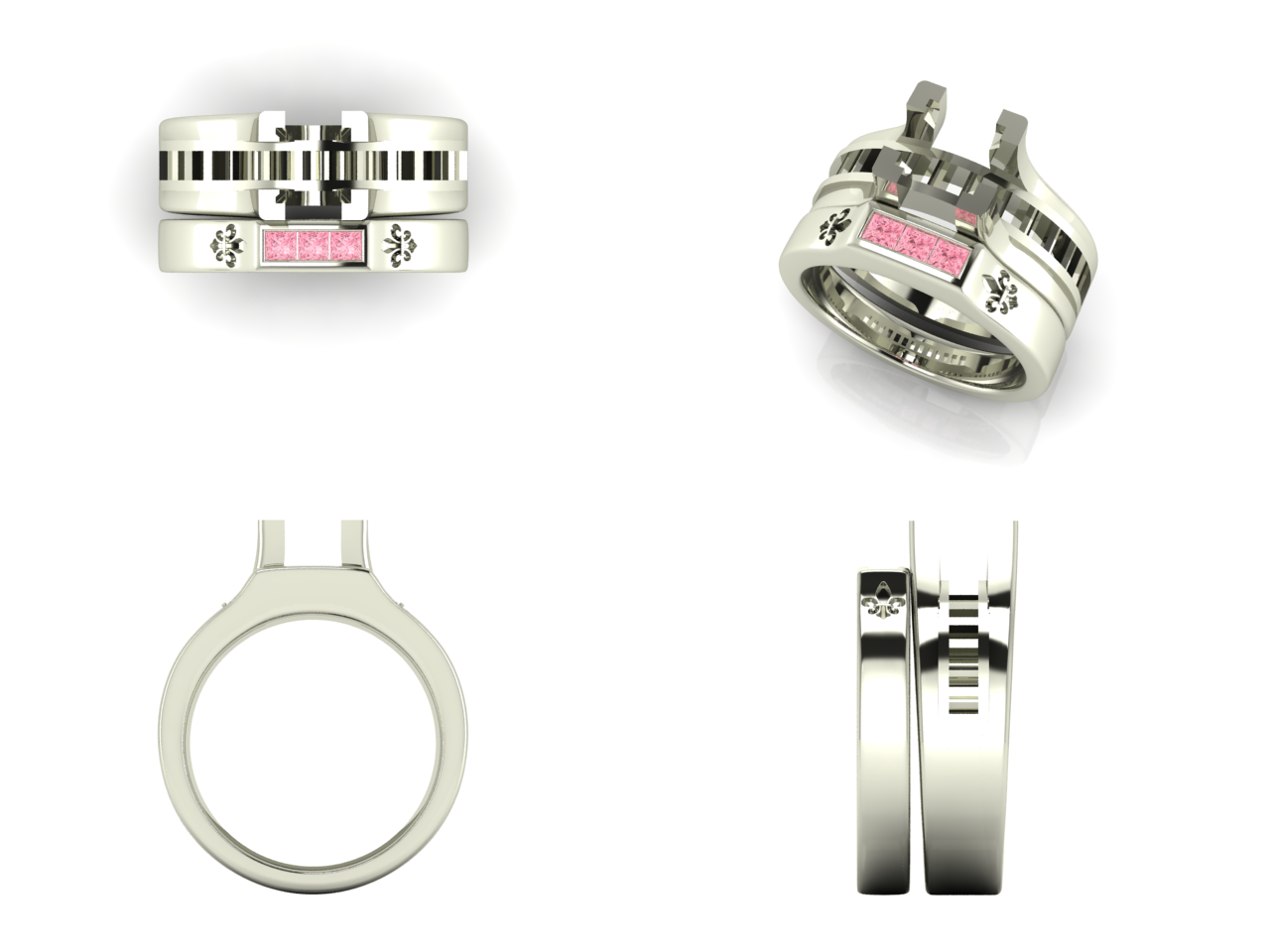 This stunning ring is custom designed for a lovely bride! A square princess cut natural diamond is the center with pink princess cut sapphires running under the center stone and down the sides. This beautiful engagement ring will be cherished for generations to come! Her hand-fabricated band has the square pink sapphires and is accented by two fleur-de-lis crosses.
