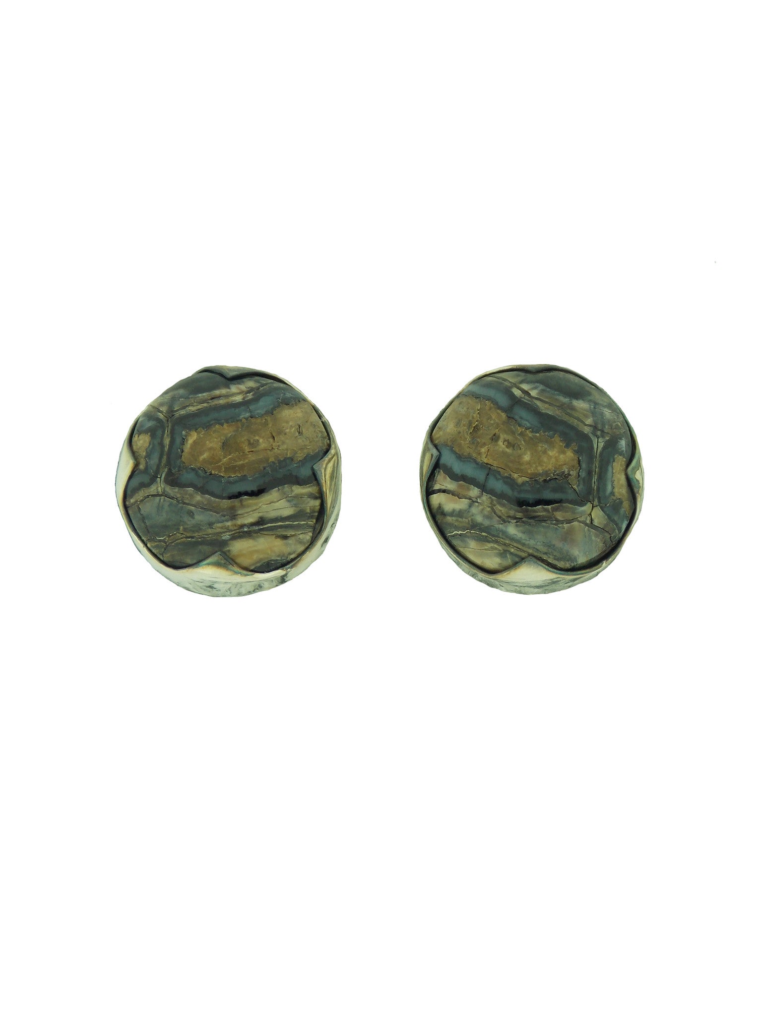 Rare, rich color of prehistoric woolly mammoth tooth root has created natures one of a kind. The earrings are 16mm in diameter and are set in sterling silver. They feature kvk wire to attach the drops from the Tokiyopeya collection. Mix and match and have fun expanding your wardrobe!